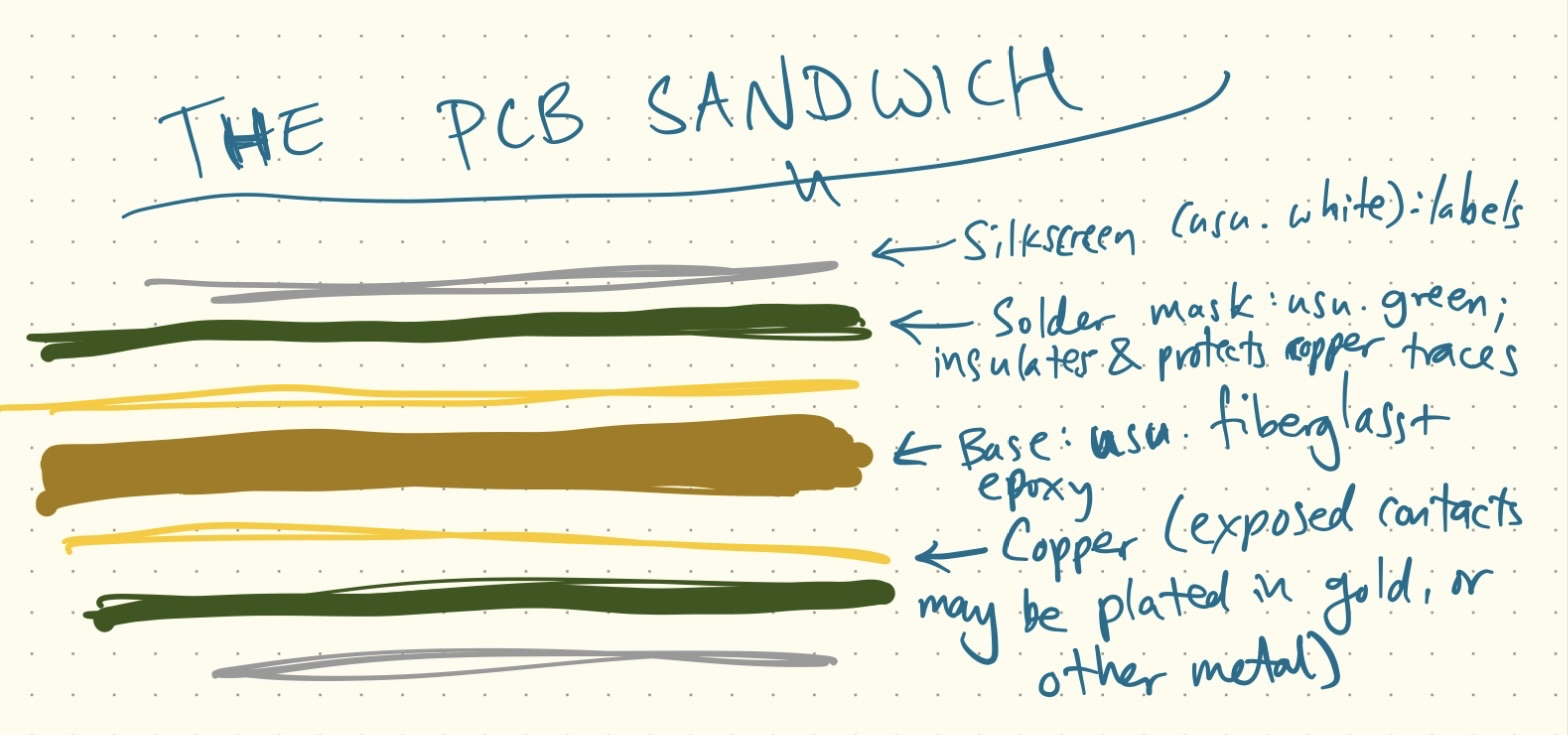 - Use Single Layer Boards wherever possible - A Printed Circuit Board is a layered sandwich with epoxy in the middle, layers of copper traces outside that, followed by insulating solder mask (the green or blue outer coating). Even with a single-layer board, a circuit is a bit of a maze where components change what's happening wherever they're attached - but at least you can see the traces and follow them to understand how things are connected. A multi-layer circuit board is basically a three dimensional maze where you can't even see the internal layers. This makes fixing them more difficult. It also increases the difficulty of producing them.