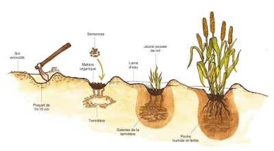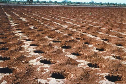 For a similar practice applied to agriculture, and restoring degraded soil in drylands, take a look at Zaï (aka tassa) from the Sahel region in Africa. This is a traditional farming practice which was reintroduced in the 1980s where people dig pits in less permeable soil to catch water and concentrate compost/manure. In examples which include the excavated soil being used to form small dykes on the downhill side of the hole, the similarities are striking.